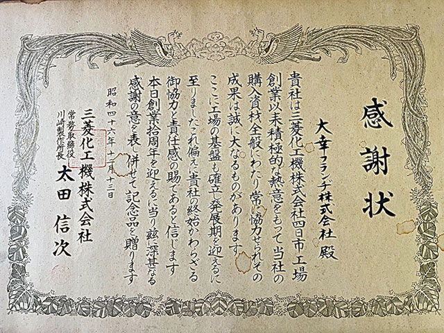 | 昭和36年1月 | 販路拡張に伴い、法人組織に改組し、資本金100万円にて大幸フランヂ株式会社を設立 |